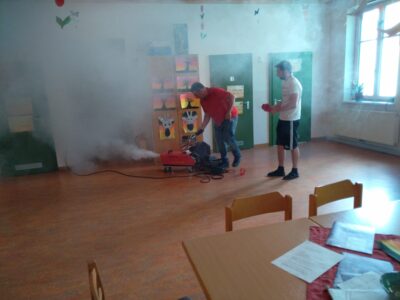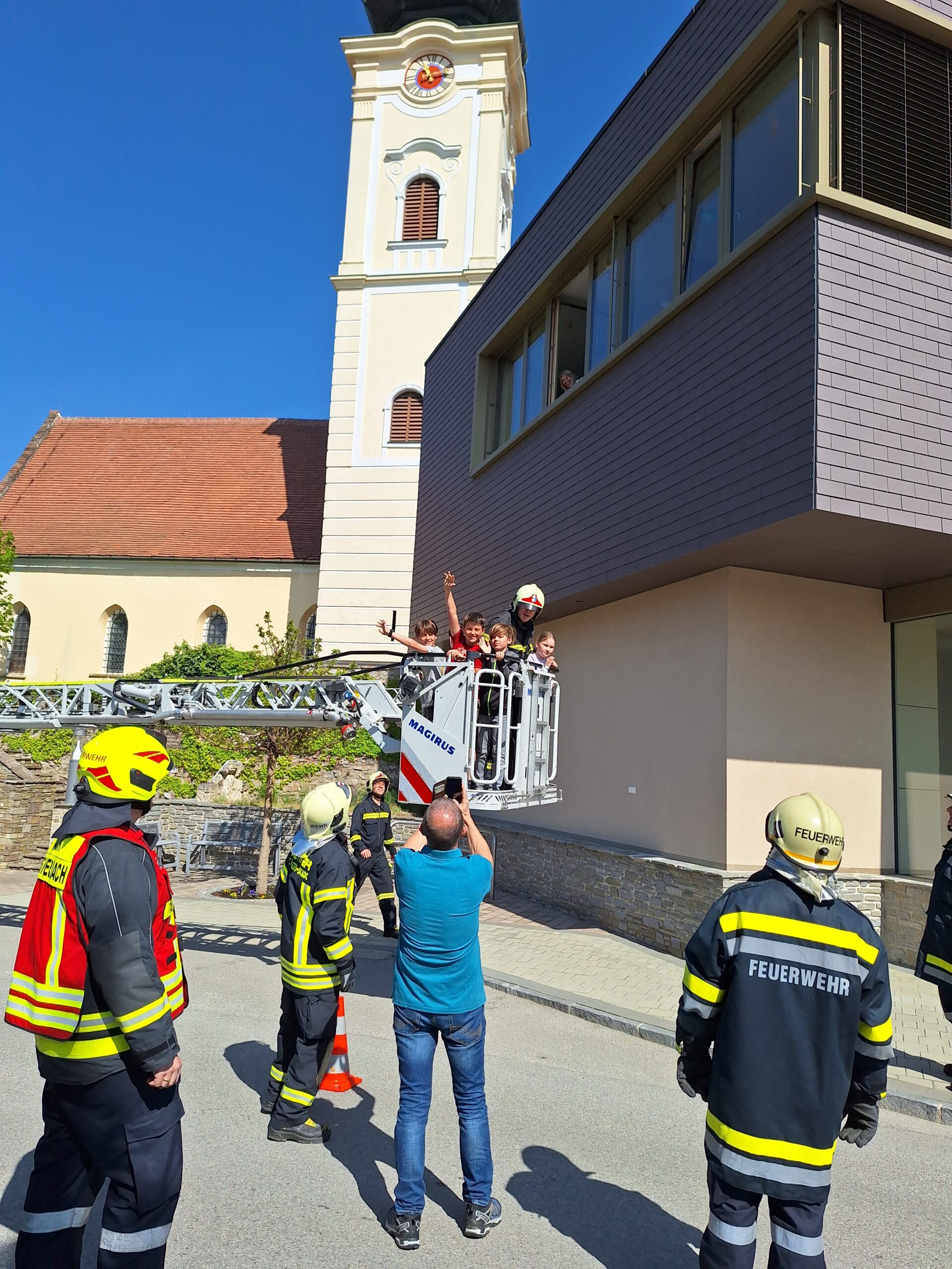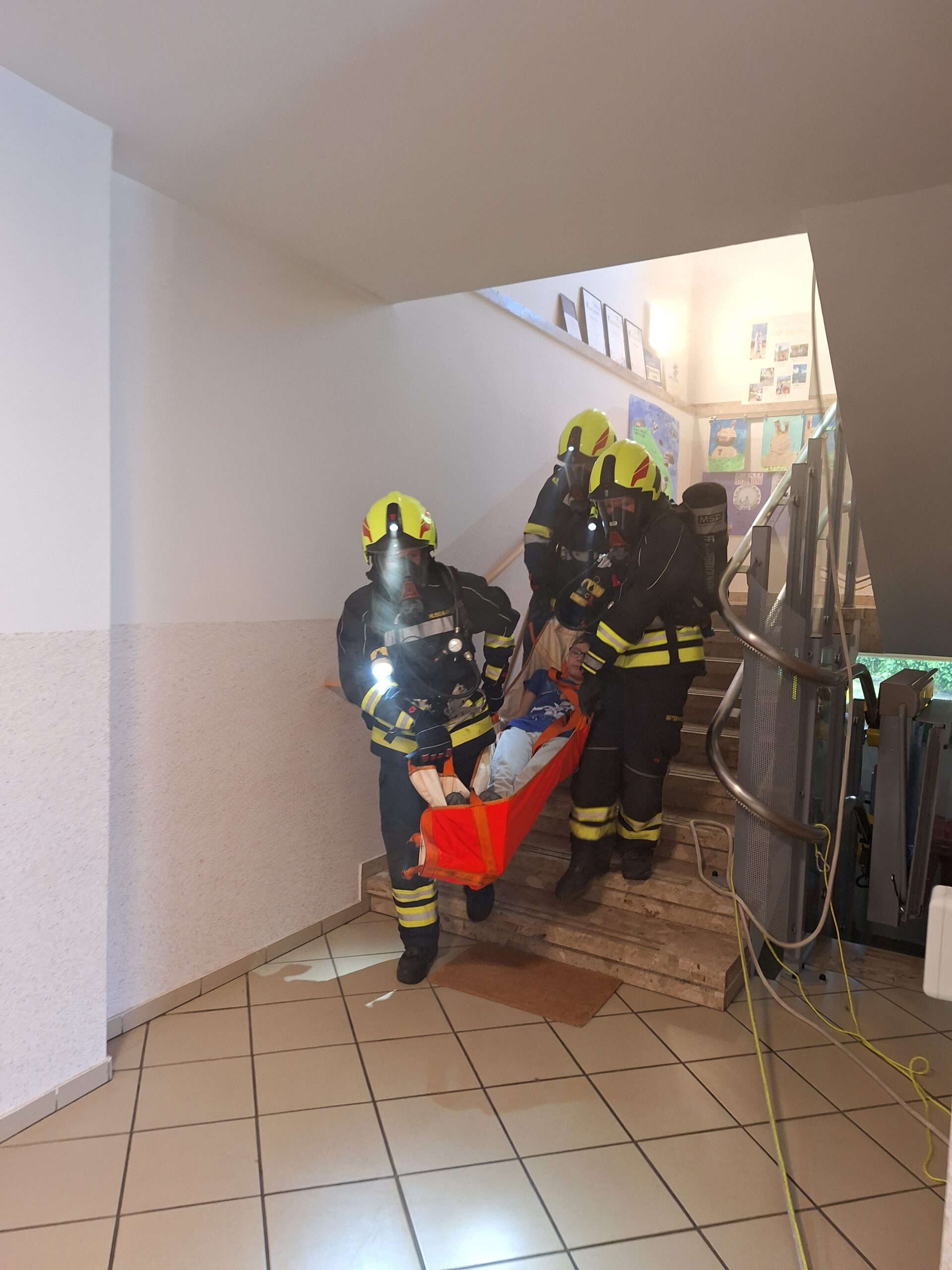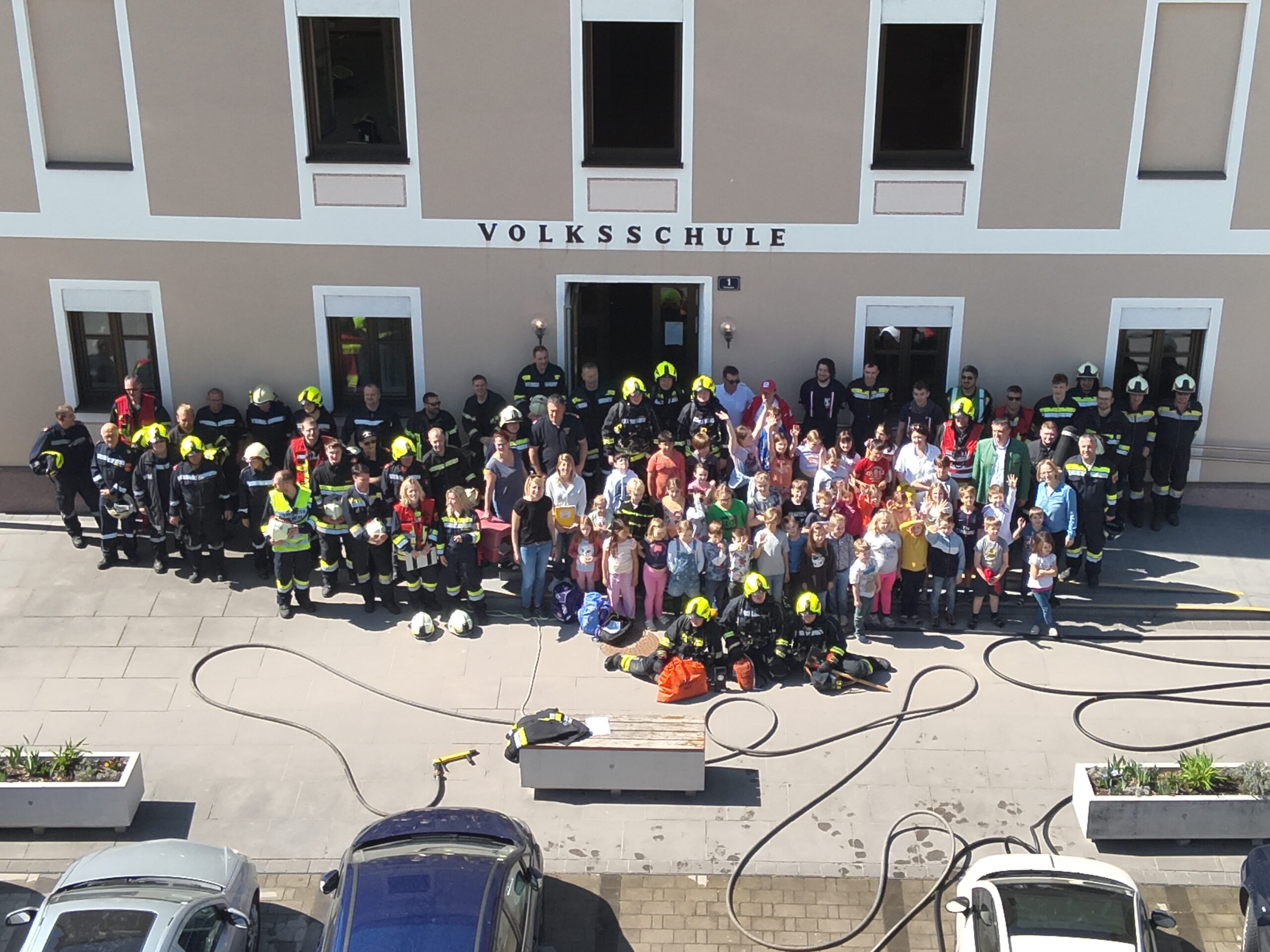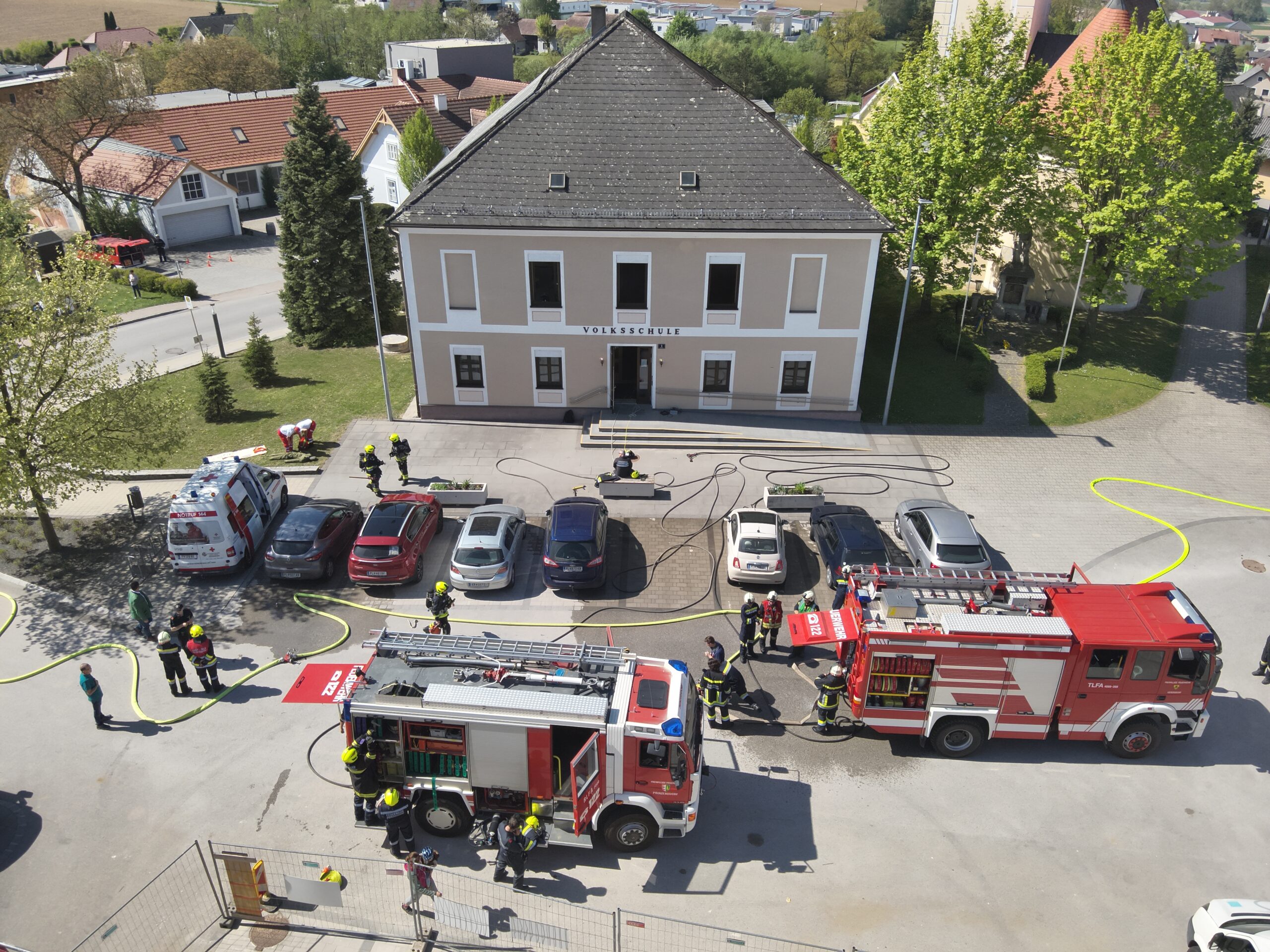 Um Punkt 11 Uhr ging der Alarm los. 3 Klassen waren während dem Eintreffen der Einsatzfahrzeuge schon auf den Sammelplatz. Vor einer weiteren Klasse gab es eine dichte Rauchentwicklung, sodass die Kinder und die Lehrperson mit der Drehleiter der Feuerwehr St. Pölten Stadt gerettet werden mussten.