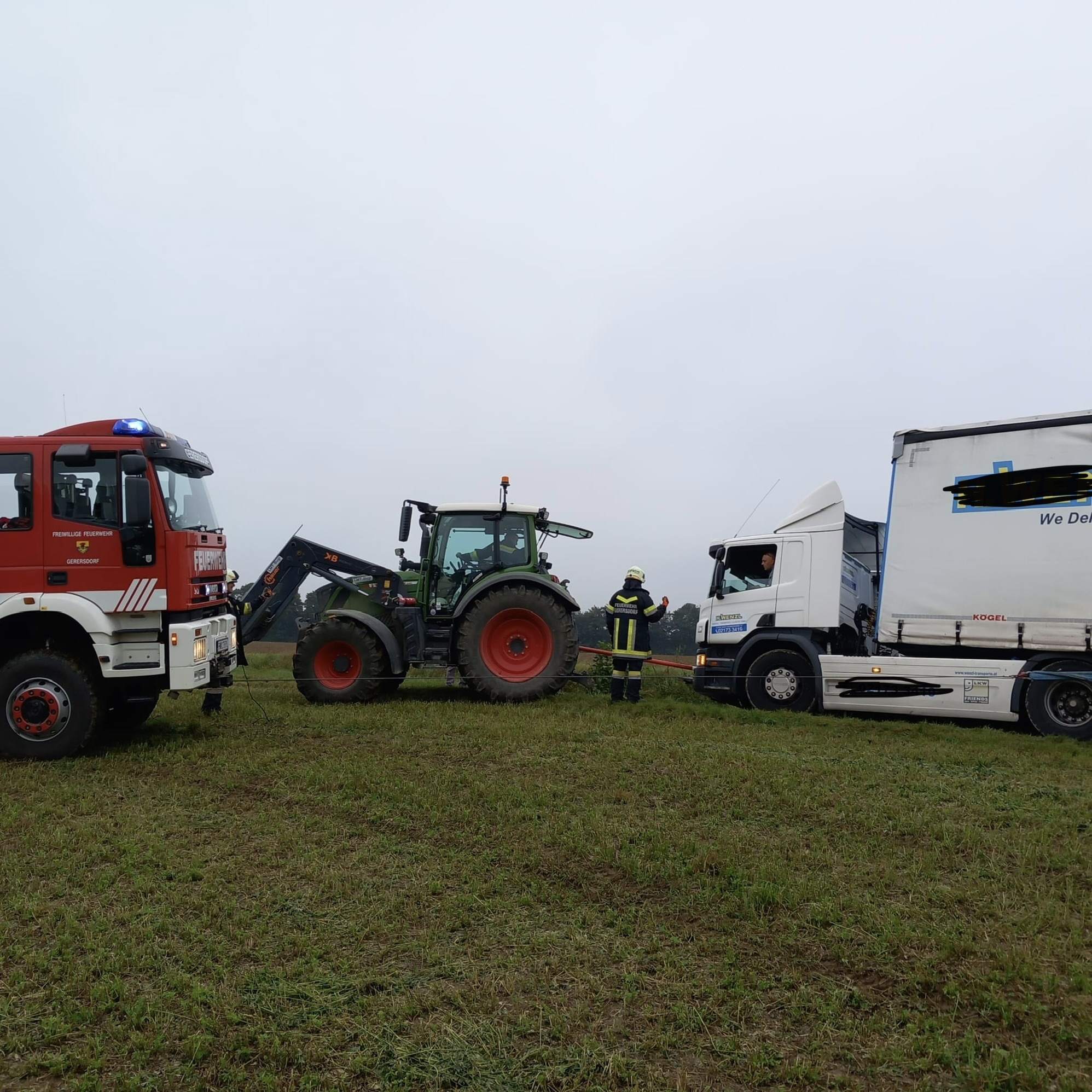 Gemeinsam mit unserem Tanklöschfahrzeug und einem Traktor konnte der Lastwagen mithilfe der Seilwinde wieder herausgezogen werden.