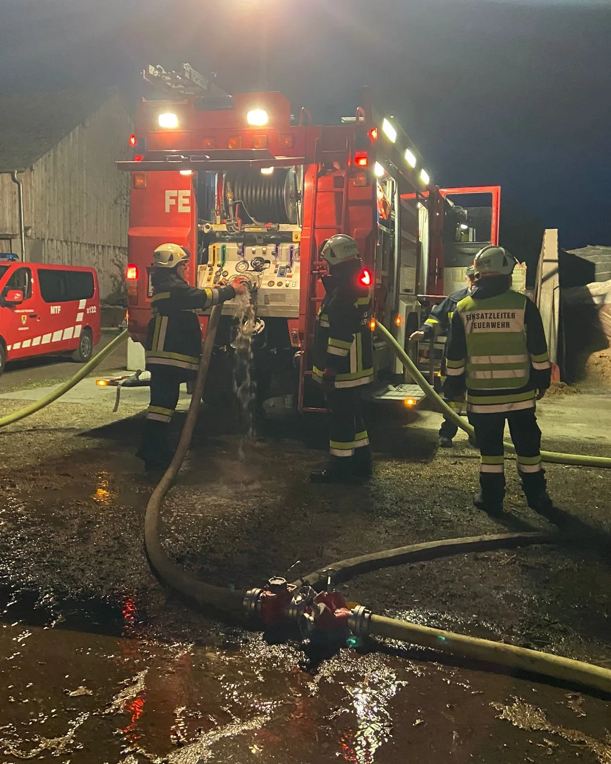 Annahme war der Brand eines landwirtschaftlichen Objekts, mit einer Verpuffung im Obergeschoss. Unter einem schwerem Atemschutz wurden mit Hilfe der Wärmebildkamera zwei vermisste Personen gefunden und gerettet. Die Wasserversorgung wurde von der Pielach hergestellt.