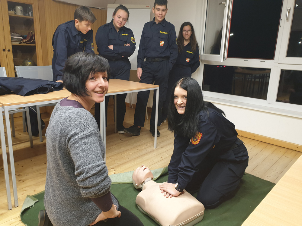 Im Stationsbetrieb wurden die stabile Seitenlage, die Herzdruckmassage und das Anlegen eines Druckverbandes geübt. Ein großer Dank für die Ausbildung gilt Dr. Marion Kaufmann und Kathi Loidl.