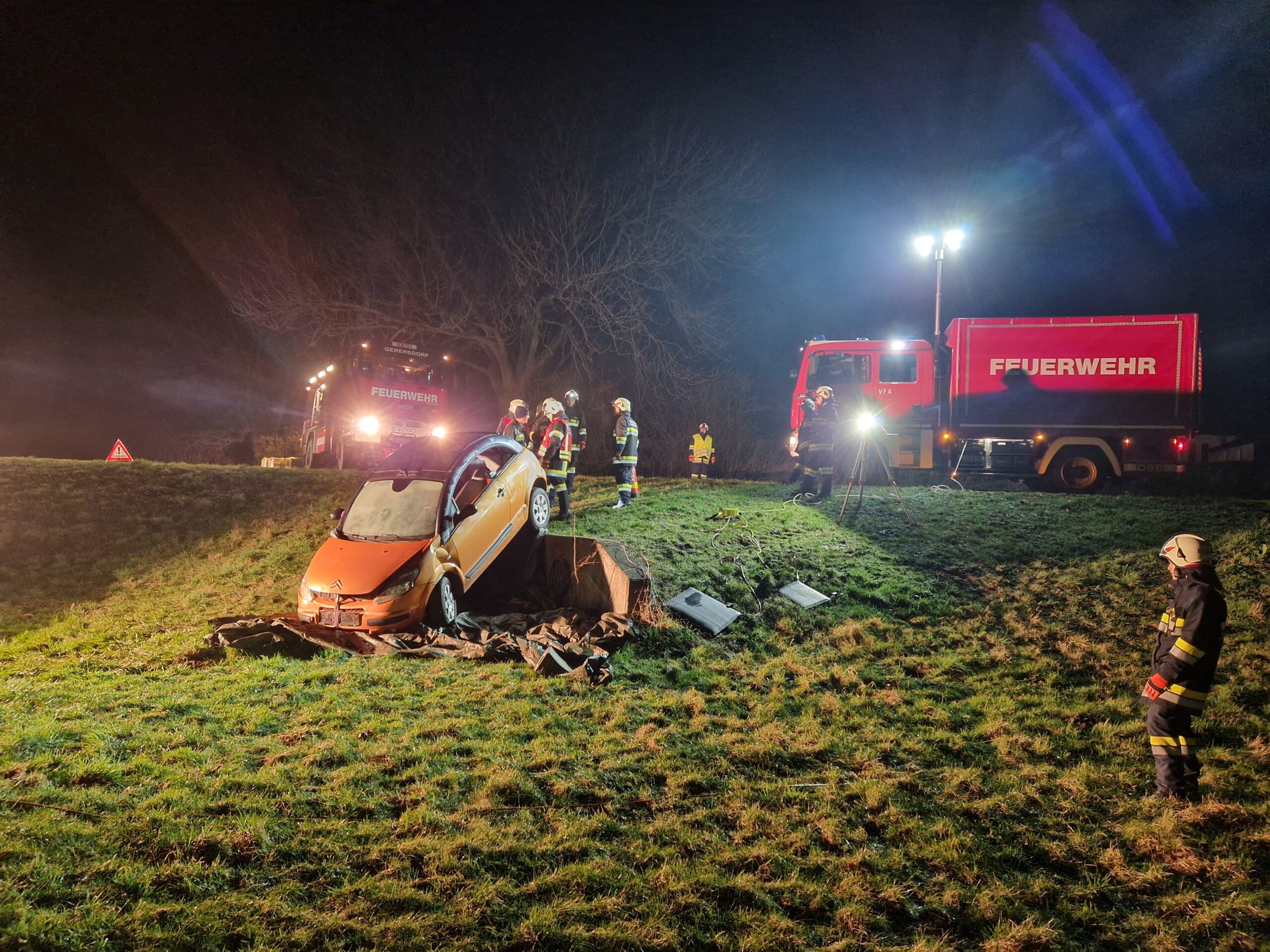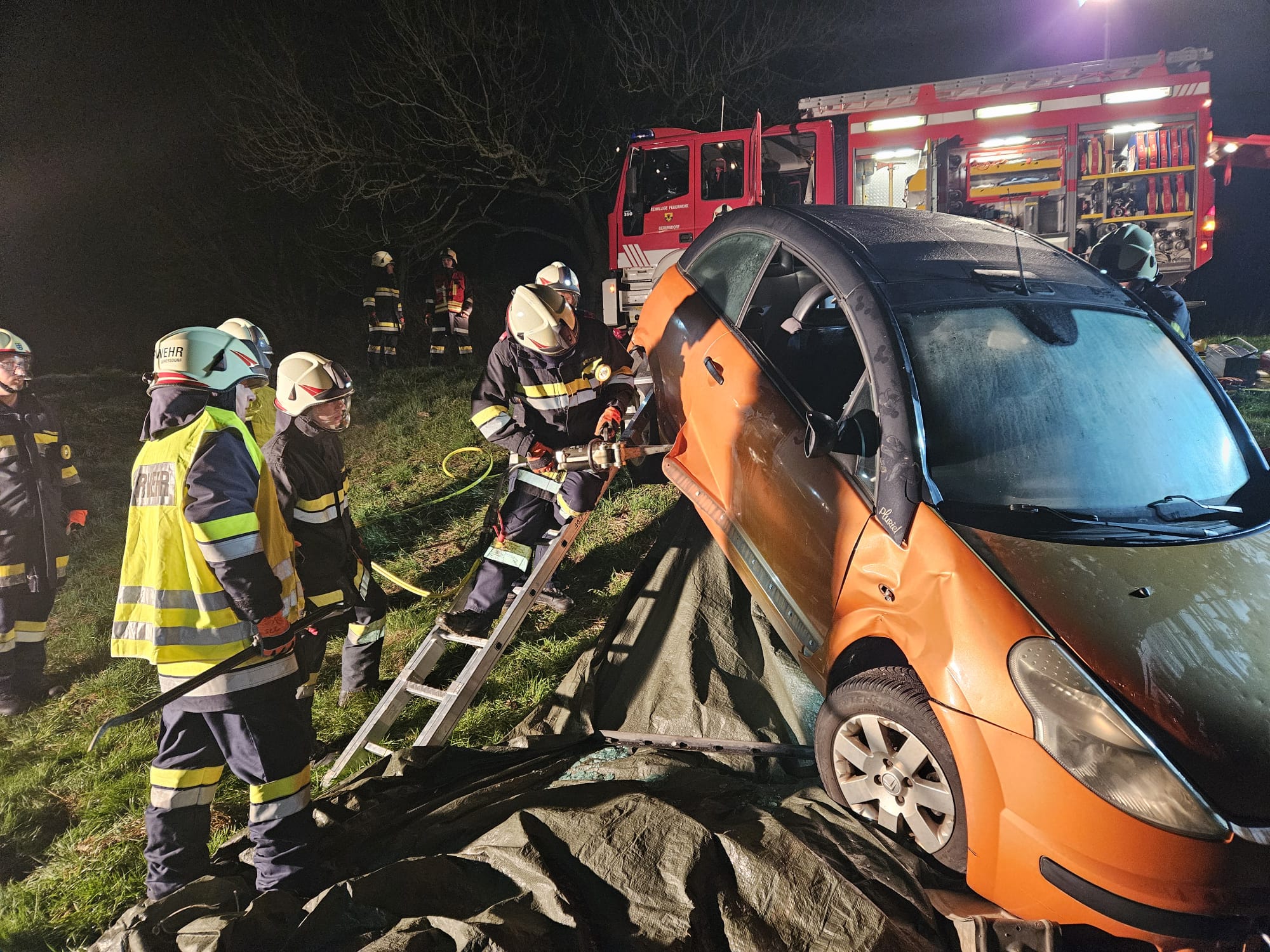 Annahme war ein Verkehrsunfall mit einer eingeklemmten Person. Es wurde nachgestellt, dass ein PKW vom Straßenrand abgekommen und gegen einen Wassereinlauf gestoßen ist.