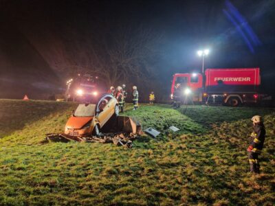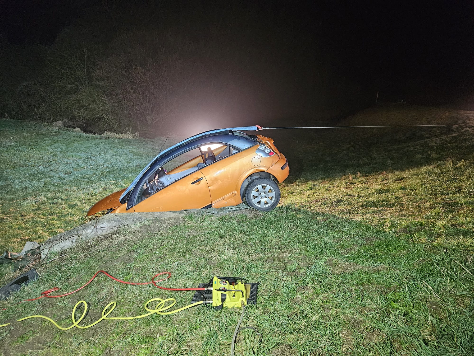 Mit dem hydraulischen Rettungssatz wurde rasch eine Tür entfernt, sodass die Person schon nach kurzer Zeit gerettet werden konnte. Danach wurde das Auto mittels Seilwinde zurück auf die Straße gezogen.